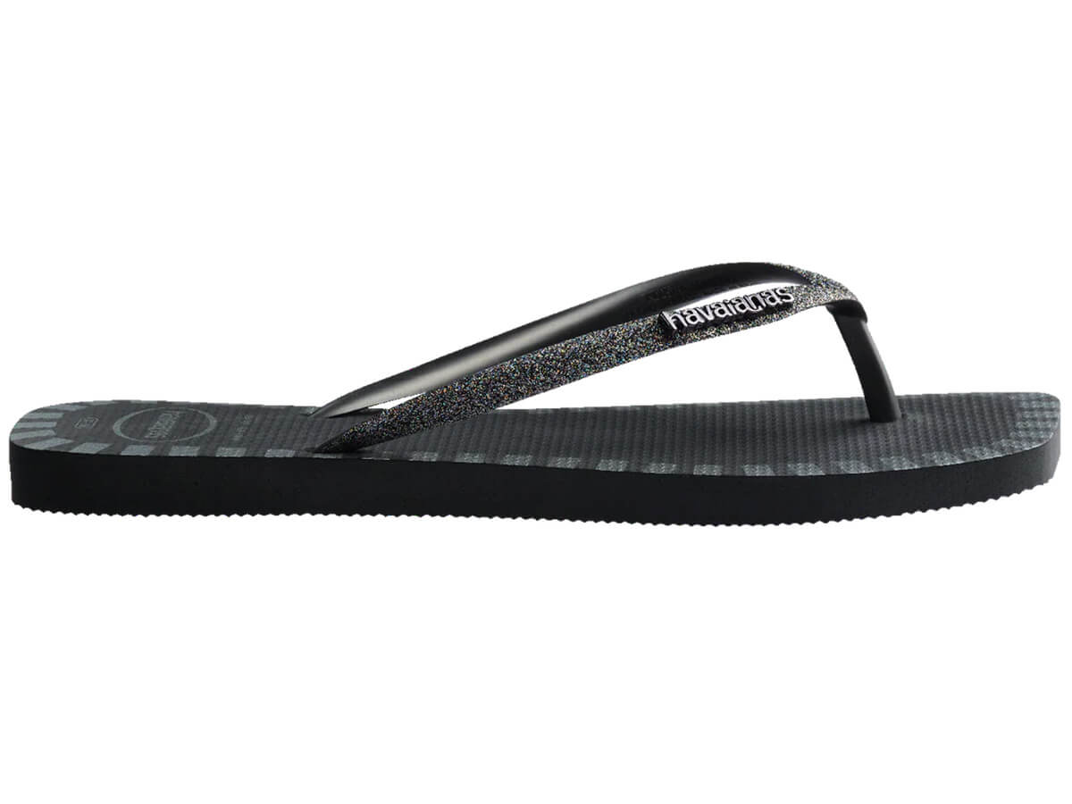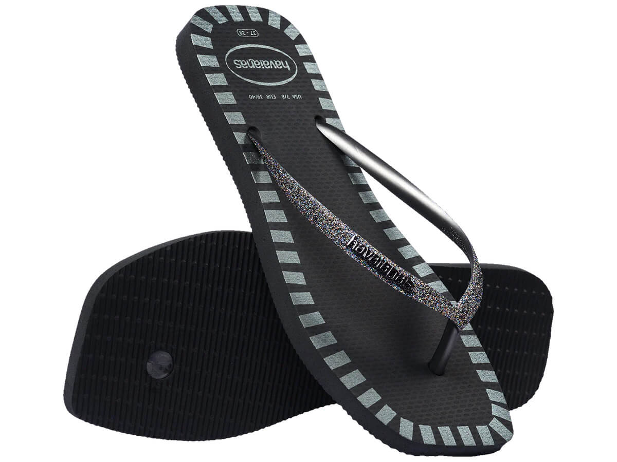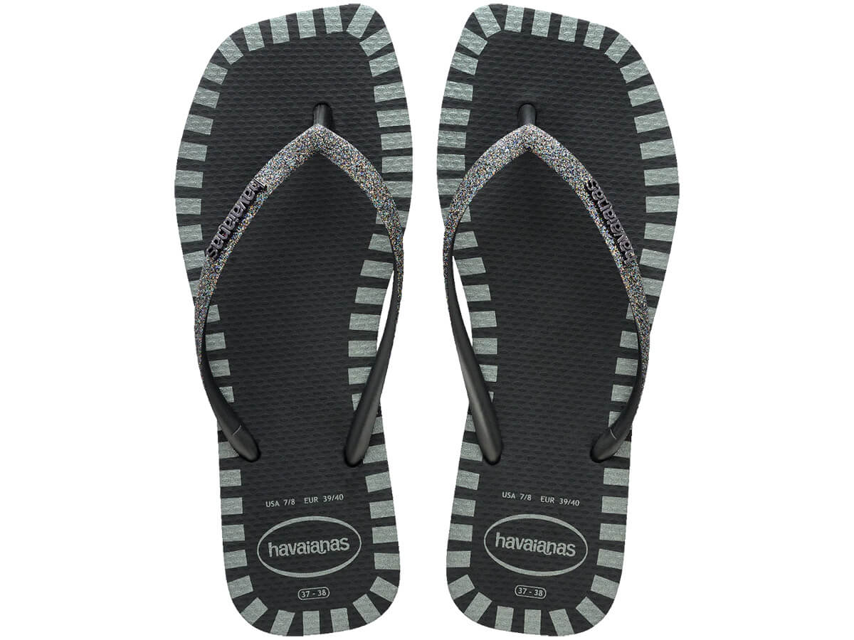 A Havaianas Slim Square Glitter Contour é uma sandália que combina a modernidade do design com bico quadrado com a sofisticação das tiras com glitter. É uma versão elegante e moderna do clássico chinelo da marca.