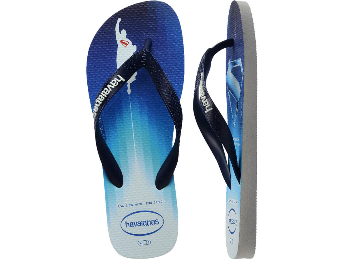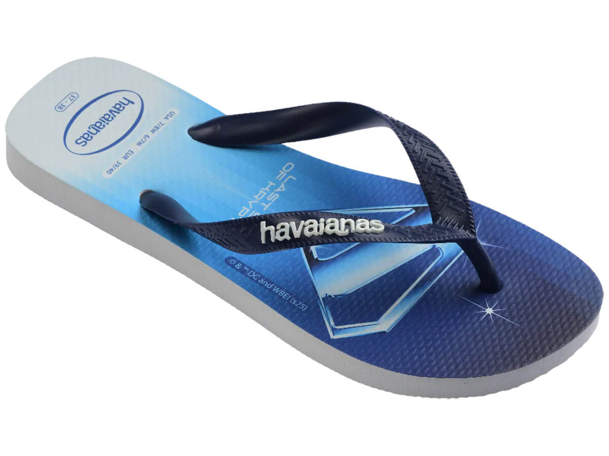 Dois dos heróis mais amados e famosos de todos os tempos direto para o seu chinelo! A sandália Havaianas Top Heróis DC traz duas estampas incríveis: do Batman e uma estampa inédita do Superman inspirada no novo filme do Homem de Aço. Modelo top, o produto ainda conta com tiras em cores contrastantes e logo Havaianas em destaque. Compre agora!
