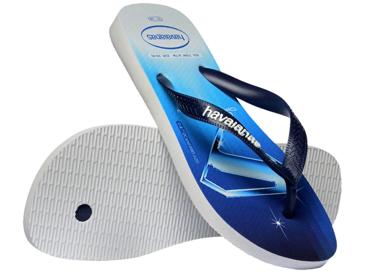 Dois dos heróis mais amados e famosos de todos os tempos direto para o seu chinelo! A sandália Havaianas Top Heróis DC traz duas estampas incríveis: do Batman e uma estampa inédita do Superman inspirada no novo filme do Homem de Aço. Modelo top, o produto ainda conta com tiras em cores contrastantes e logo Havaianas em destaque. Compre agora!