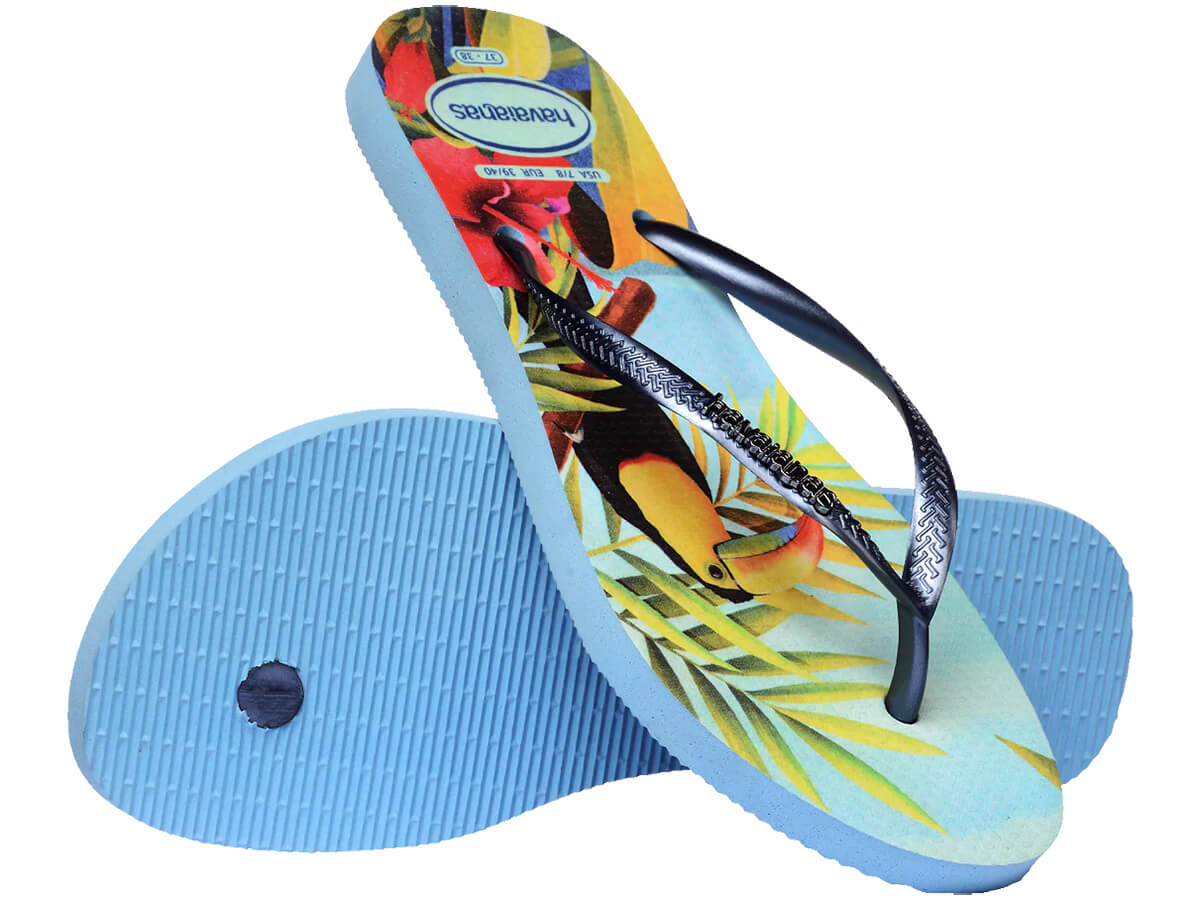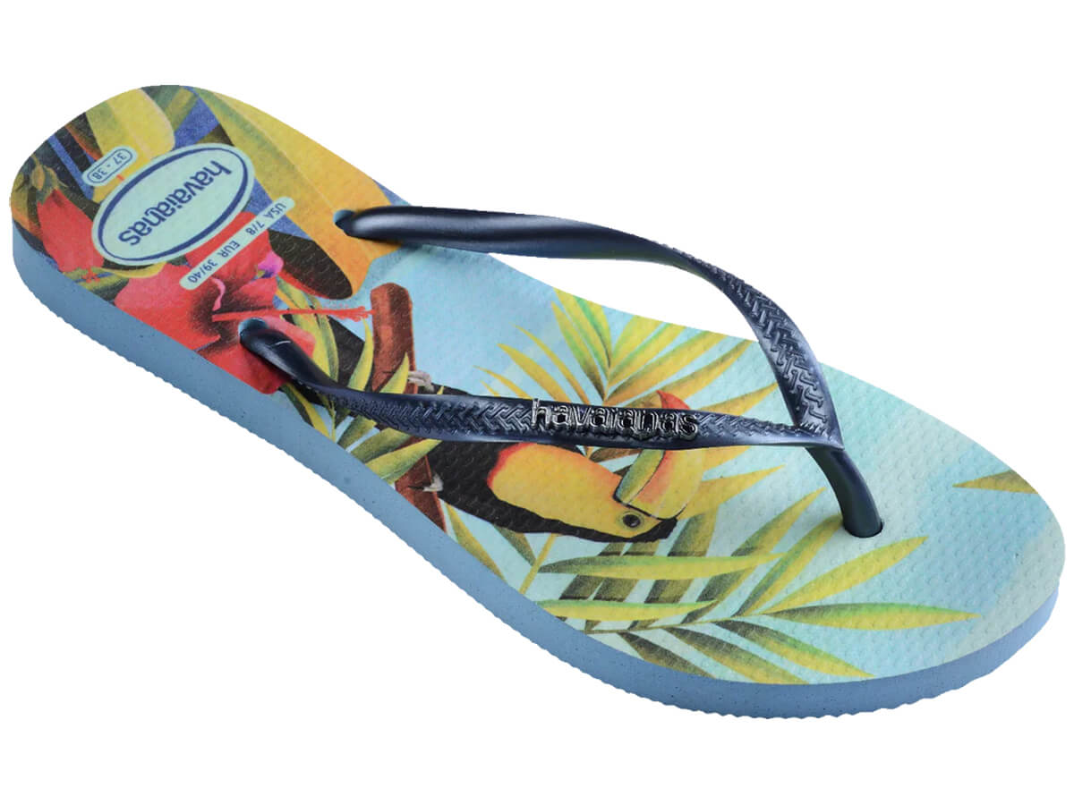Vai um pouco de verão aí? O chinelo feminino Havaianas Slim Tropical traz a estação mais quente do ano para os seus pés. Clássica, essa sandália vem com as delicadas tiras slim que todo mundo conhece em versão metalizada, além do icônico logo Havaianas metálico aplicado nelas. Além disso, o solado antiderrapante possui lindas estampas de paisagens tropicais. São duas opções perfeitas para você escolher.